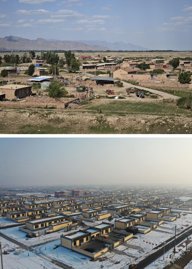 拼版照片:上图为2023年6月8日拍摄的田家圪旦村拆除前村貌(新华社记者贾立君摄);下图为2024年2月7日拍摄的田家圪旦新村村貌(无人机照片,新华社记者李志鹏摄)。新华社发