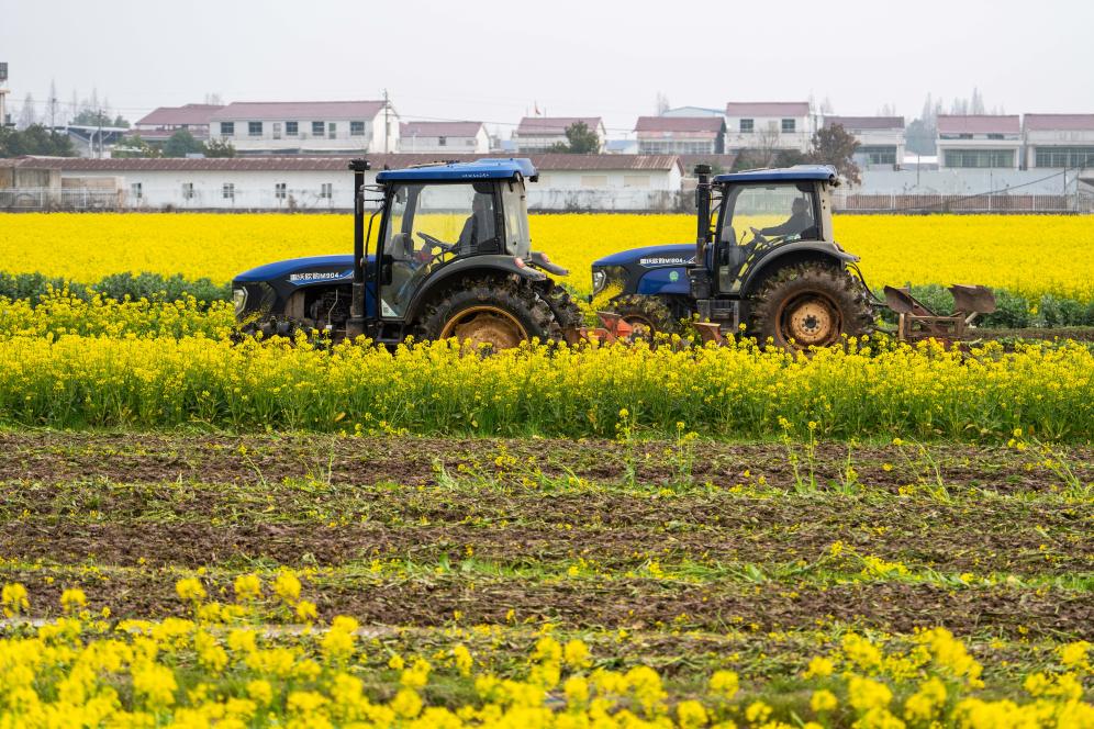 2025年2月25日,在沅江市草尾镇乐园村,村民操作旋耕机翻耕芥兰绿肥。新华社记者 陈思汗 摄
